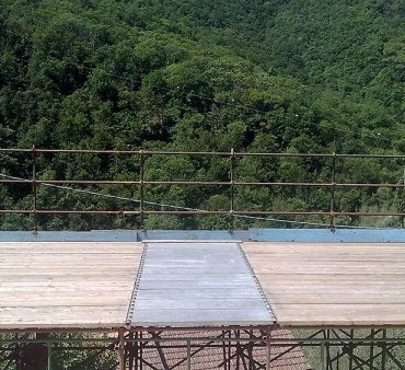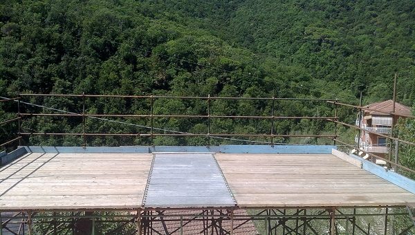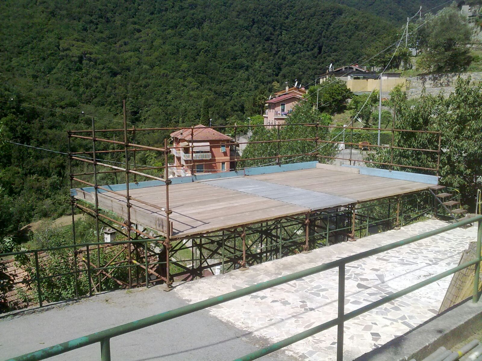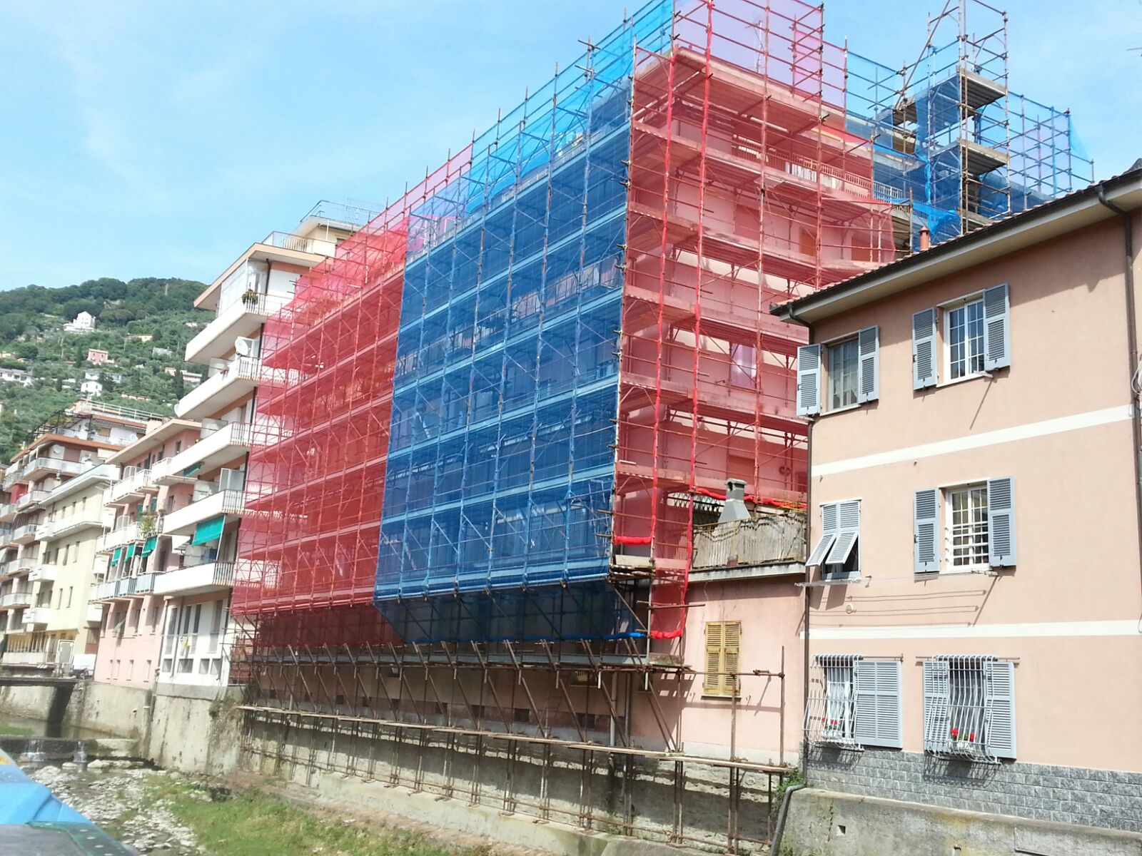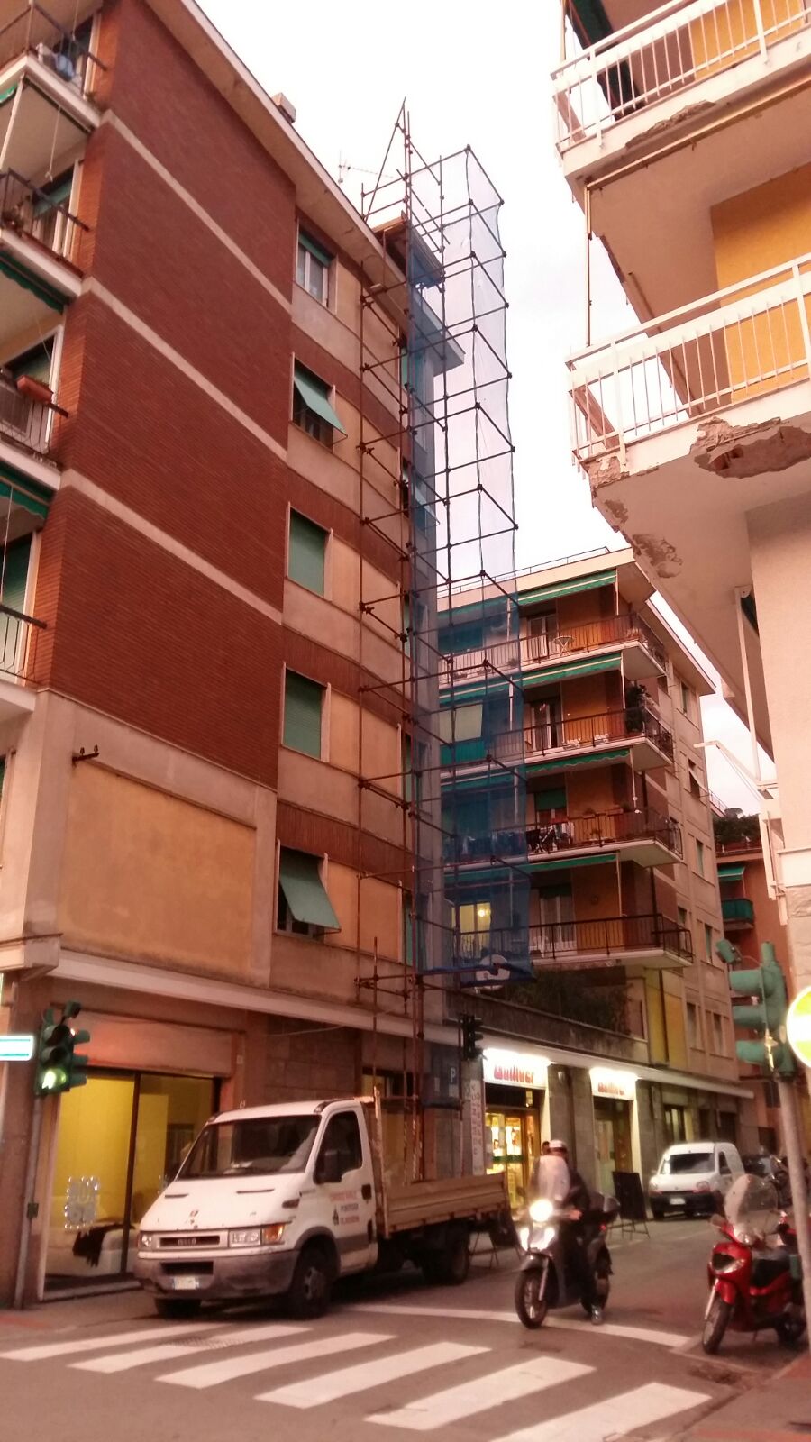 Allestimento ponteggi per restauro campanile della Basilica dei Santi Gervasio e Protasio. Il campanile pendente della basilica raggiunge i 67 metri ed è il più alto della Liguria.