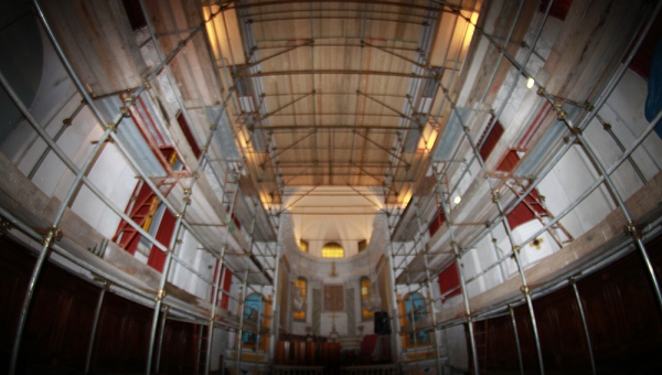 Allestimento ponteggi per restauro campanile della Basilica dei Santi Gervasio e Protasio. Il campanile pendente della basilica raggiunge i 67 metri ed è il più alto della Liguria.